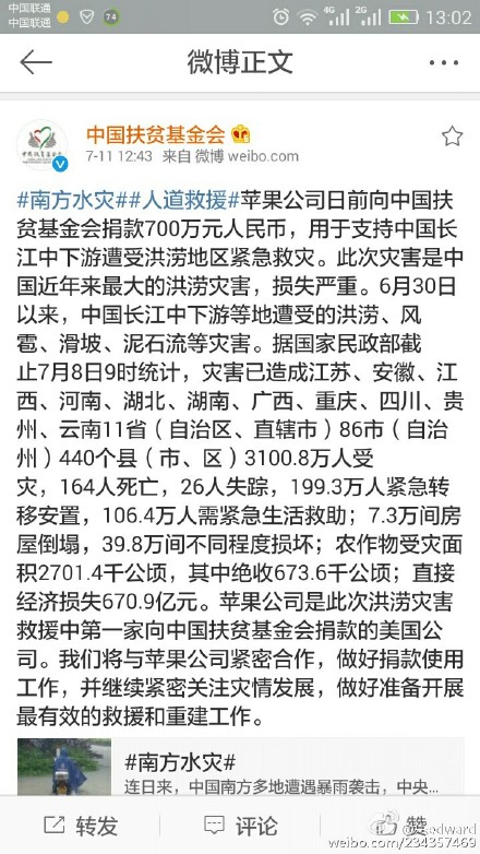 有意思的是,就在網友逼捐的同時,中國扶貧基金會今日中午宣布,蘋果公司于日前向中國扶貧基金會捐款700萬元人民幣,用于支持中國長江中下游遭受洪澇地區緊急救災。