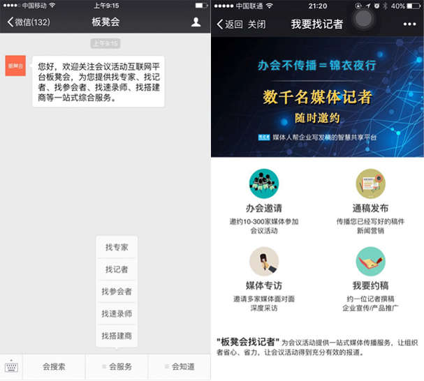 用戶通過板凳會的平臺點擊“找記者”按鈕,會出現(xiàn)會議傳播的四大場景:“辦會邀請”(媒體人出席會議功能)、“通稿發(fā)布”(會議宣傳稿多家媒體傳播)、“媒體專訪”(多家媒體深度采訪會議相關嘉賓)、“我要約稿”。在基于這些功能下,“板凳會”和“找記者”雙方將共享企業(yè)客戶資源,共同建立會議傳播新模式,提升雙方在各自領域的服務維度。